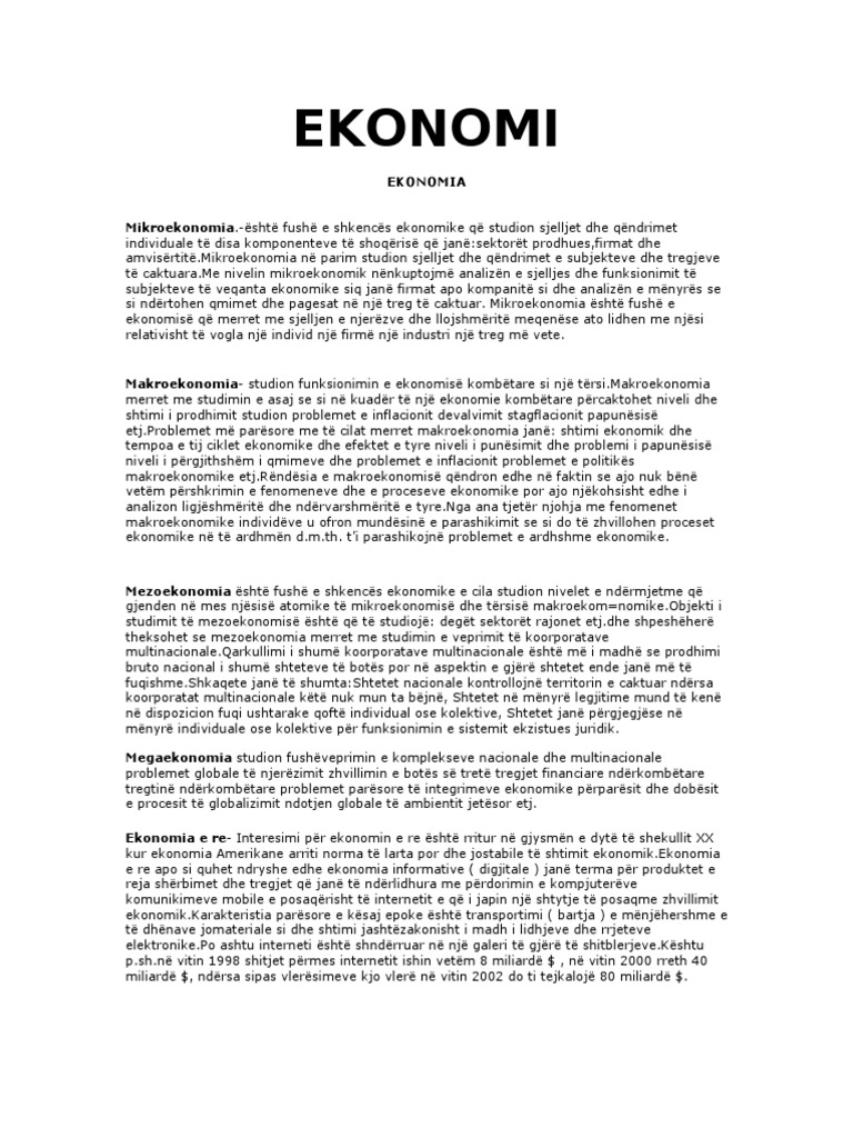 C eshte ekonomia. Ekonomia trajton mjetet financiare bankat kapitalin dhe pasurinëKëto fushëveprimtari të ekonomisë mund të permblidhen ne një definicion te përbashkët. Ndryshe ekonomia njihet si shkencë e cila studion të gjitha marrëdhëniet që zhvillohen gjatë një. Mikroekonomia Ekonomia kombëtare përbëhet prej subjekteve të ndryshme ekonomike dhe institucioneve të tjera që me veprimin e tyre gërshetohen në jetën praktike kanë varësi reciproke e funksionale mes vete dhe si të tilla formojnë ekonominë e vendit përkatës.