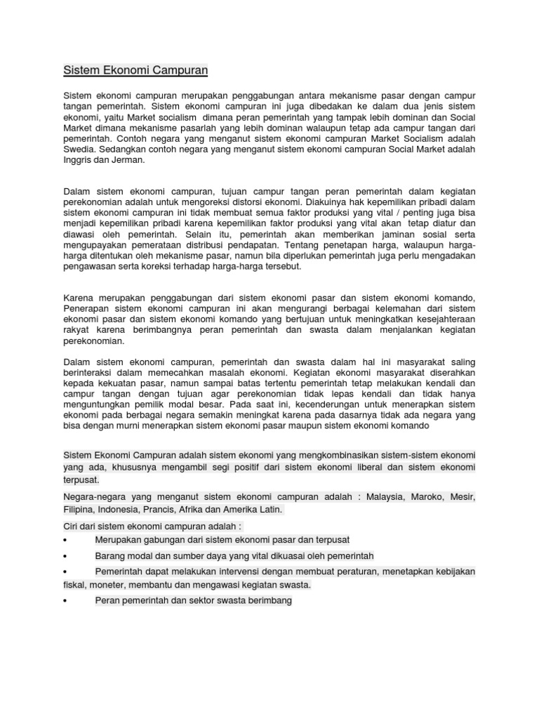 Sistem Ekonomi Campuran Mixed Economy Tentorku